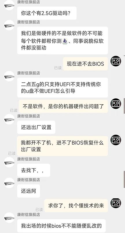 这很明显是硬件问题,但客服一边说自己是搞硬件的,一边硬把问题往软件上靠。连 BIOS 都进不去,系统都因到不了,我是不明白这个客服是怎么得出“是软件问题”的答案: