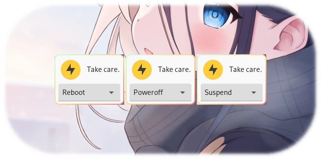 但 Hyprland 没有这种设计(至少我没找到),遇到上面这种情况就很头疼,之前我都是通过 bemenu 手动执行 poweroff, reboot 之类的指令,但最近写了个脚本用 YAD 显示菜单: