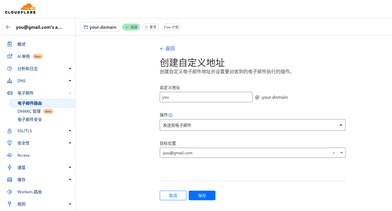 完成后所有发到 you@your.domain 的邮件都会经过 CloudFlare 转发给 you@gmail.com ,间接实现了用自己的域名接收邮件并用 Gmail 管理。
